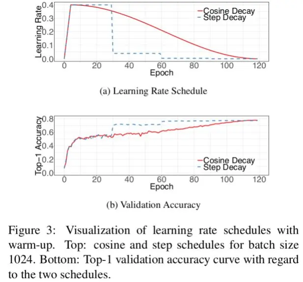其中, t 和 T 分别是训练当前和总批量数(不计预热阶段)。相比阶梯衰减,余弦衰减保持比较长时间的大学习率。此外,使用较大的学习率有缓解过拟合的效果。