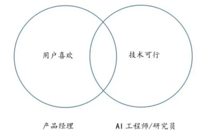 产品经理与工程师/研究员的不同关注点。产品经理的关注点是哪些是用户喜欢的,AI研究员/工程师的关注点是哪些是技术可行的。最后得到的产品是这两部分的交集。