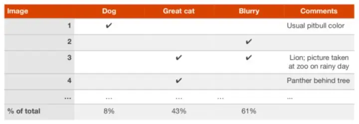 基本思路。很多时候有许多的改进思路,你需要知道每个思路能带来的收益(即对性能的改进)有多少,根据此来判断是否需要投入时间和精力进行这项改进。具体来说,误差分析是从观察验证集中随机选择一些(例如100个)模型分错的样例,人工观察这些样例,判断其对应于哪一项分错的原因,见下图。最后依据最后一行百分比,可以得到每项改进能获得的收益的上限的估计。由于一个样例可能同时有多个分错的原因,所以最后一行的总和可能超过100%。如果一开始你想不到一些可能的分错原因也没关系,观察一些样例之后你将很可能发现一些其中的分错原因。