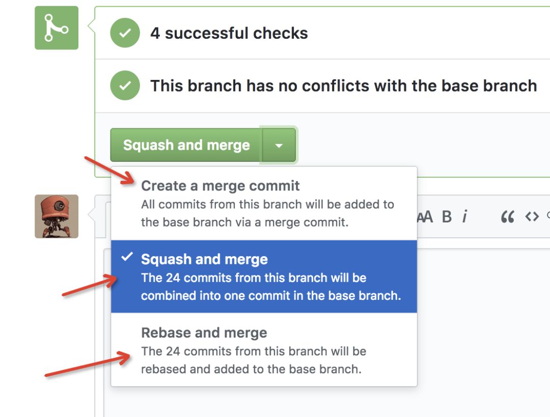 这里简单追溯一点历史:在最早期的时候,github 还没有提供 squash merge 的方式,当我们向开源仓库提交一个 PR 时,在仓库作者 review 完成之后一般会要求提交者将 commit 合并,因此很多人都有谷歌过「如何合并 commit」这样的关键词,而如今只需要点一下按钮即可,这也是工具对效率提升的一个体现。