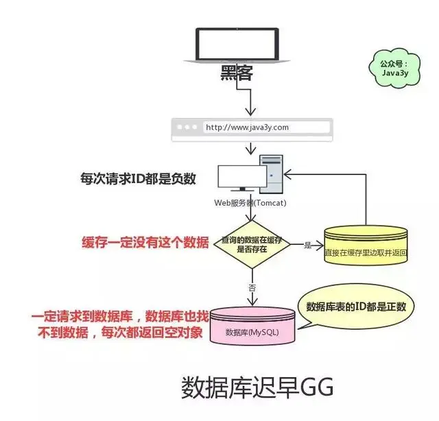 但是可能有黑客想把我的数据库搞垮,每次请求的ID都是负数。这会导致我的缓存就没用了,请求全部都找数据库去了,但数据库也没有这个值啊,所以每次都返回空出去。