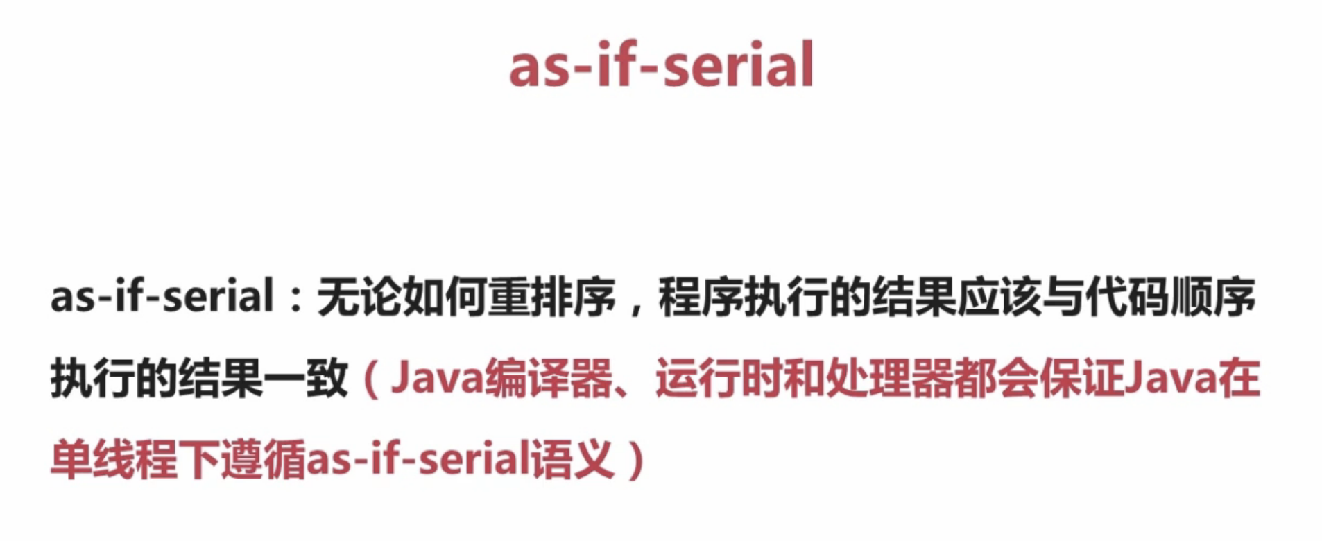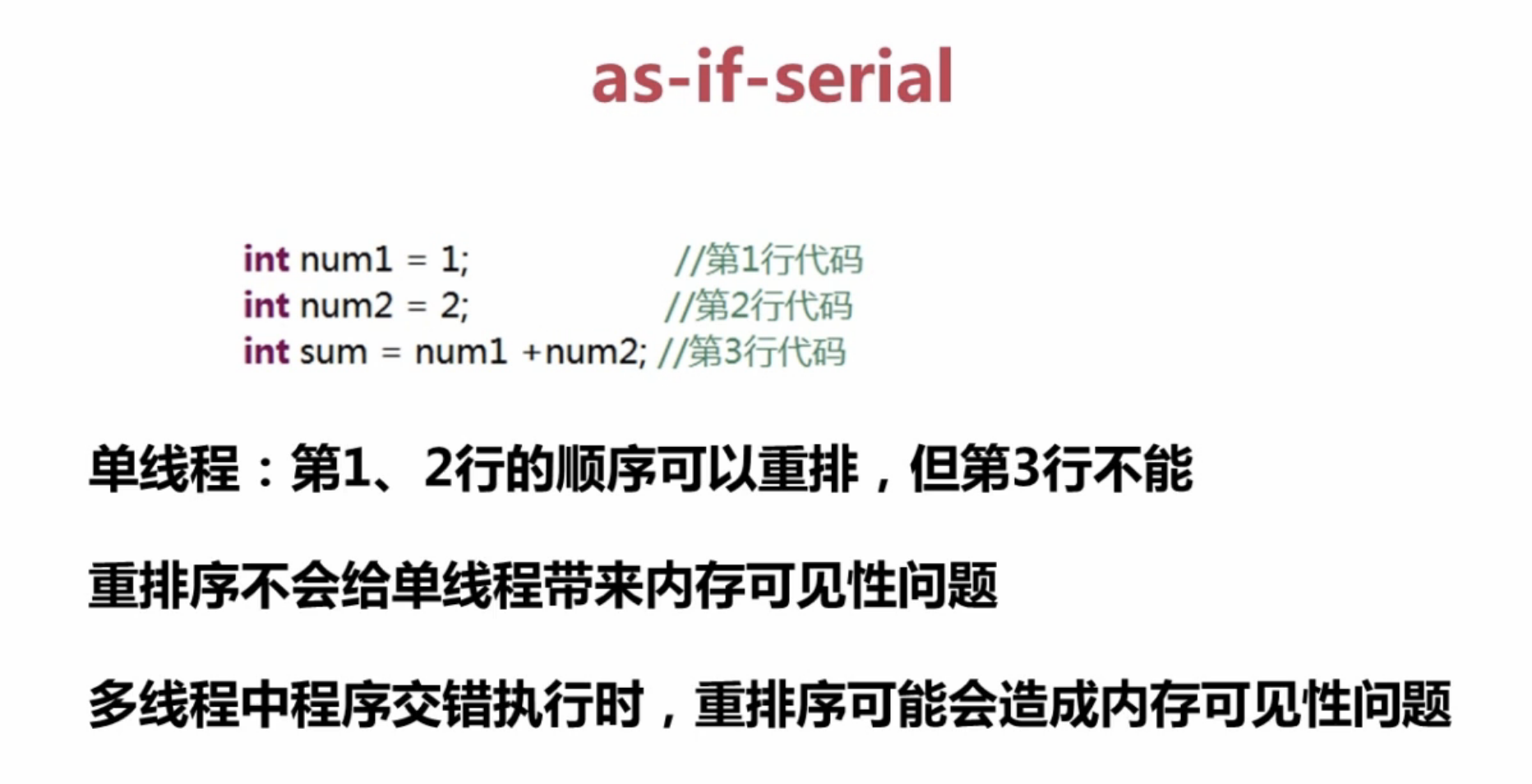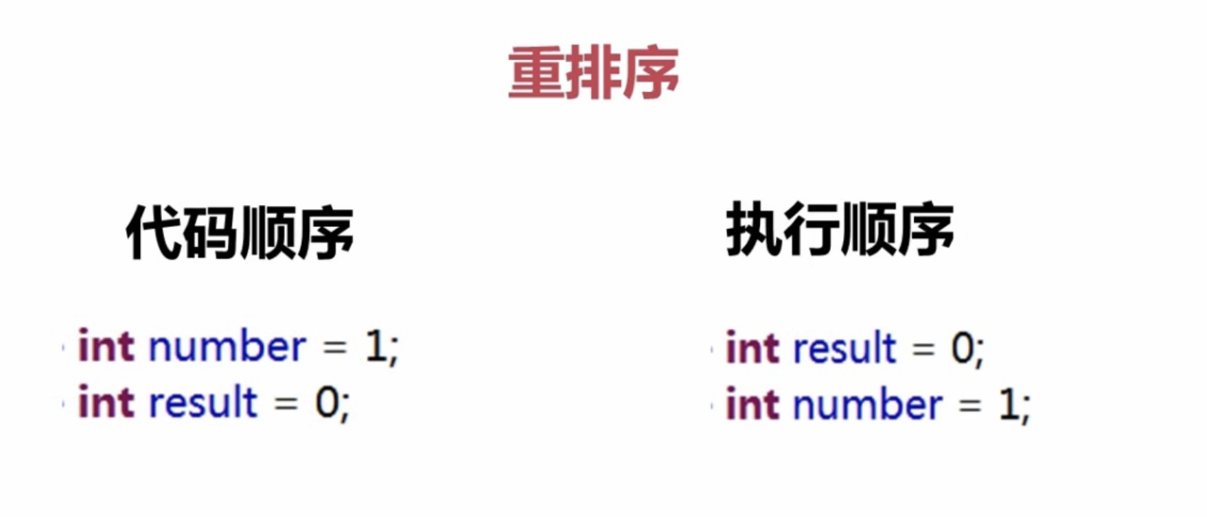 定义:代码书写的顺序,与执行的顺序不一致,重排序是为了使编译器或处理器更高的效率执行程序。