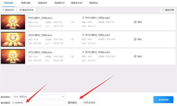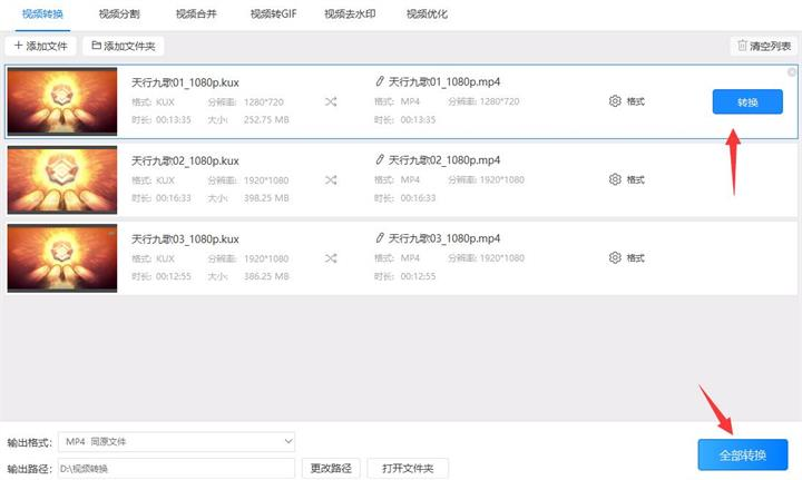 5、以上都调整好后我们可以一次点击软件中的“转换”按钮,也可以直接点击软件右下角的“全部转换”按钮进行格式转换。等待片刻软件就会自行把kux格式转换成mp4,最后我们在之前预设的输出路径(D:\视频转换)找到转换后的文件即可。