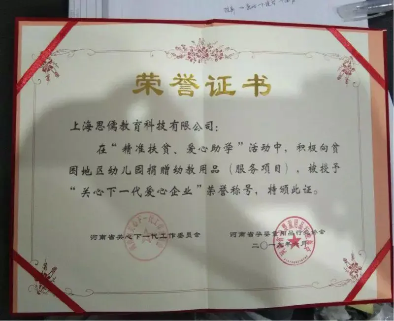 2019年6月在“精准扶贫,爱心助学”活动中,积极向贫困地区幼儿园捐赠幼教用品(5000本精选绘本),被授予“关心下一代爱心企业”荣誉称号