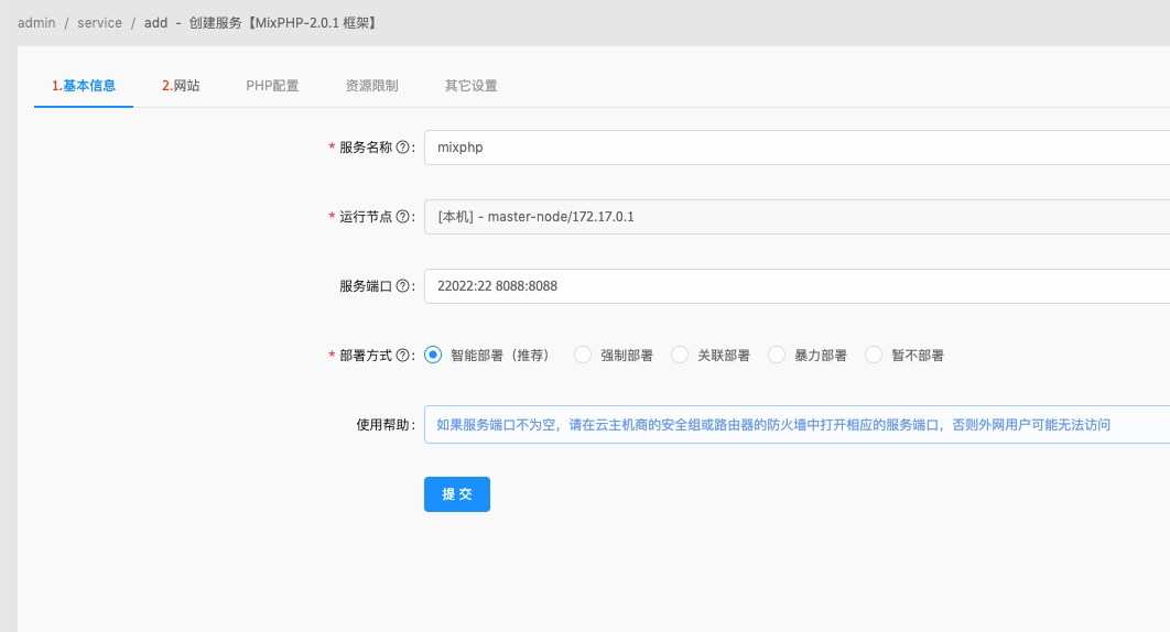填写服务名称、选择运行节点、服务端口、选择智能部署
