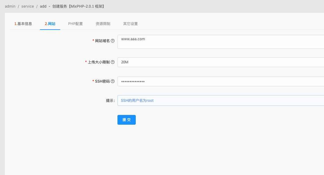 填写网站域名、ssh密码(这里的密码是root密码)