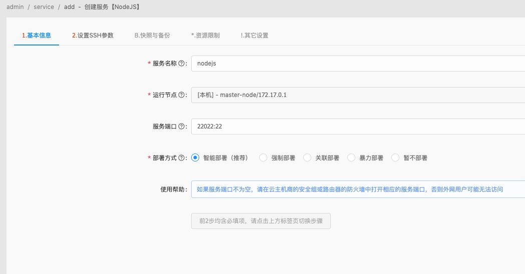 填写服务名称、选择运行节点、服务端口、选择智能部署