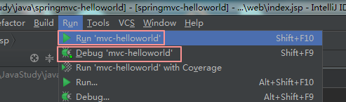 现在,Run菜单下出现了Run 'mvc-helloworld'的菜单项目(Shift+F10运行,Shift+F9调试)