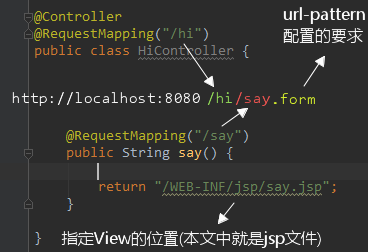 这个地方有个问题要额外说明一下,一般来说Controller代码的返回值是成字符串“say”就可以了,不需要.jsp,也不需要前边的路径,比如