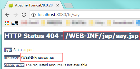 这一回是因为是“/WEB-INF/jsp/say.jsp”这个View找不到(我们刚才确实只是告诉他这个位置,但是从来没有创建过这个文件)
