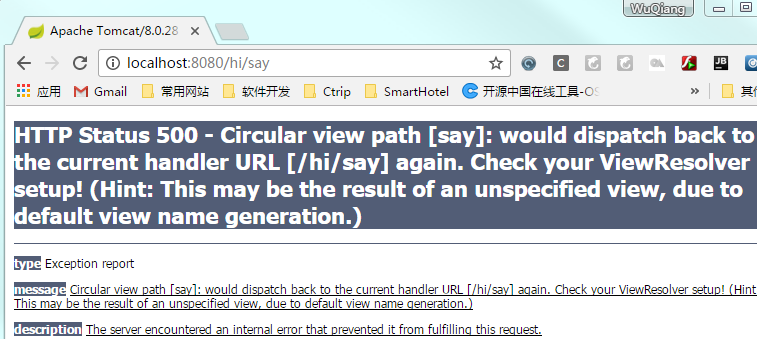 - 如果不是"/"开头的路径(也就是相对路径了),Spring会把当前路径给配上去,当前Controller路径是"/hi/"配上View的路径"say",变成了"/hi/say",Controller执行结果发给View,这个View恰恰又是Controller本身,Spring发现这是个死循环,就不再执行直接报上面的错误了