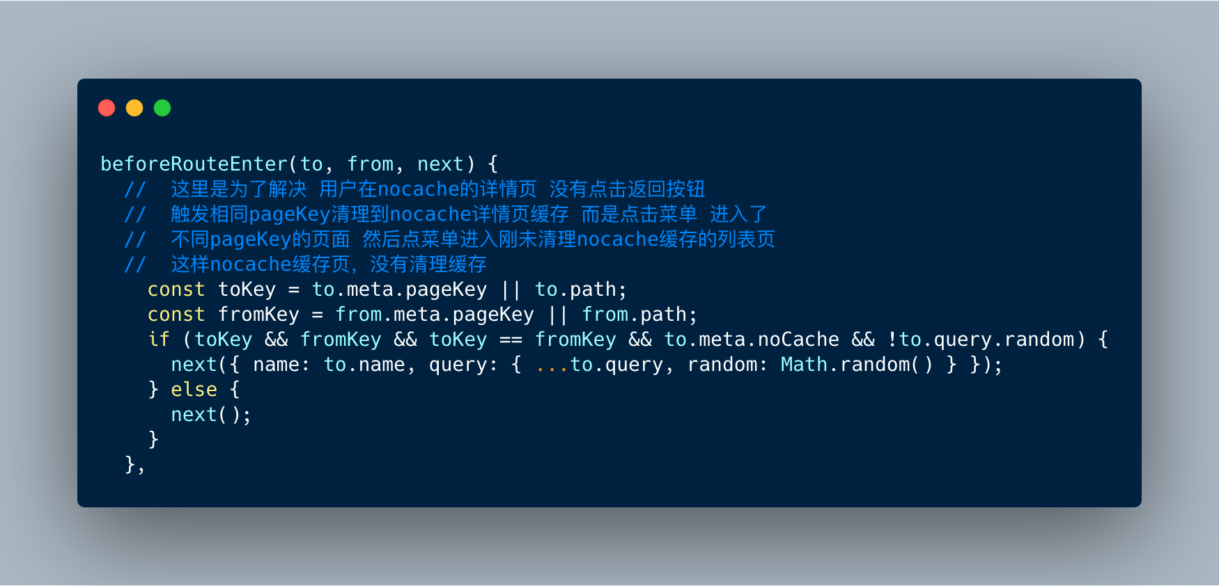 后,可以实现切换不同tab,切换路由,缓存页面,但是在同一个tab下从列表跳到详情页,我们需要详情页每次进入都需要清楚缓存重新查询数据。介于有这两种需要不同缓存效果的组件,我们在路由定义时多加了一个noCache