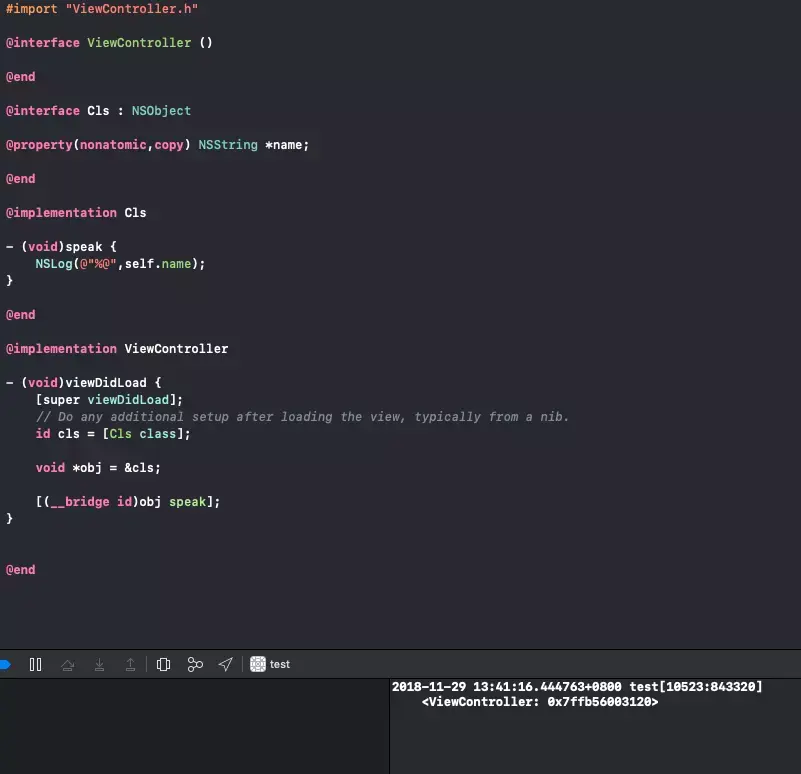 打印结果会是ViewController对象的原因是因为cls在栈上的数据结构符合了它作为真实的类时候的数据结构,cls.name原本地址正好是栈上ViewController对象地址,因此NSLog能打印出<ViewController >
