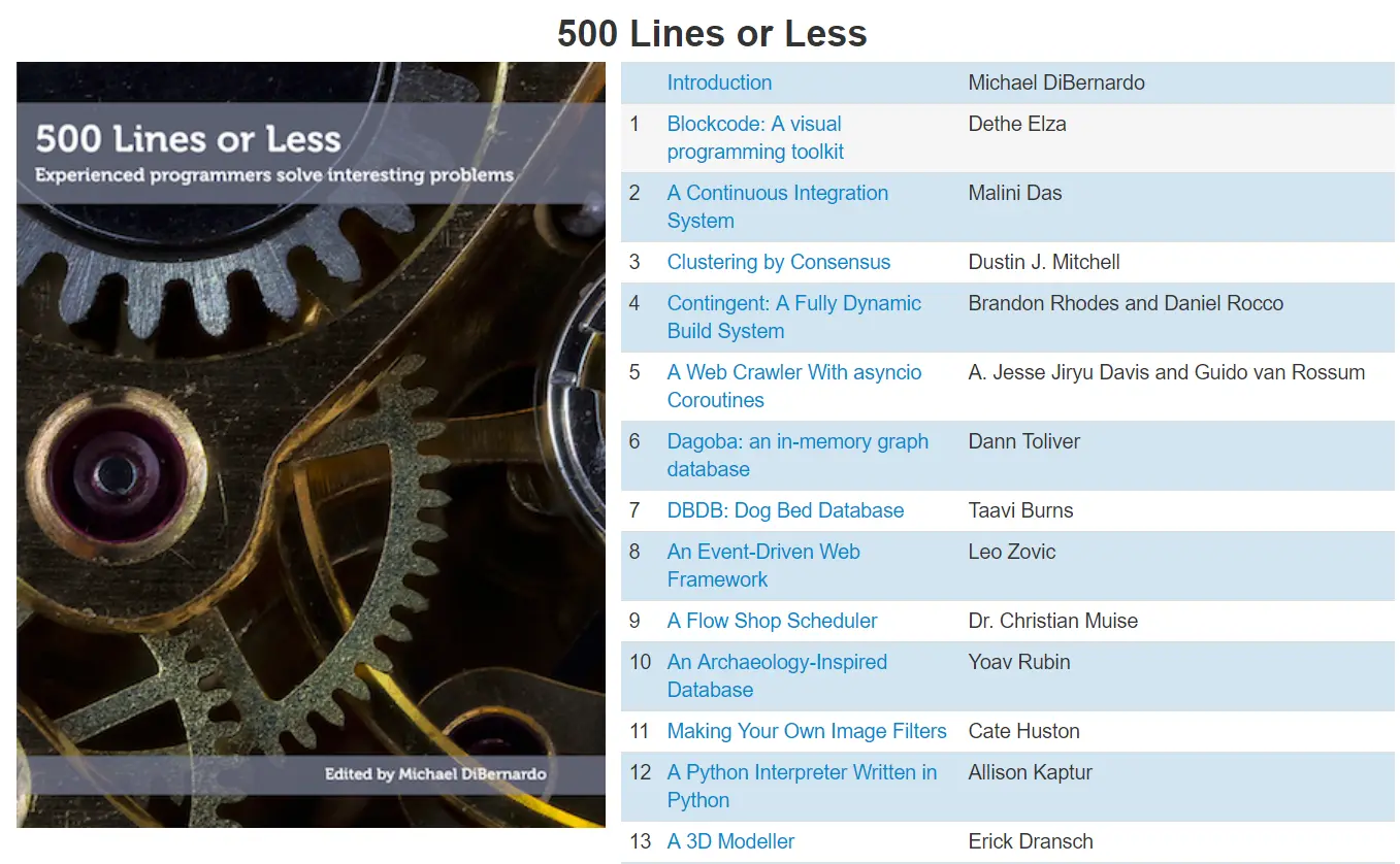 针对这个问题,该系列新出了一本《500 Lines or Less》,专注于 500 行或更少代码的小型项目。