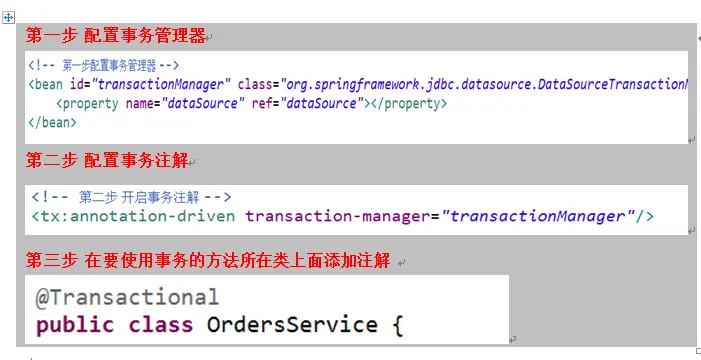 <bean id="transaction" class="org.springframework.jdbc.datasource.DataSourceTransactionManager">