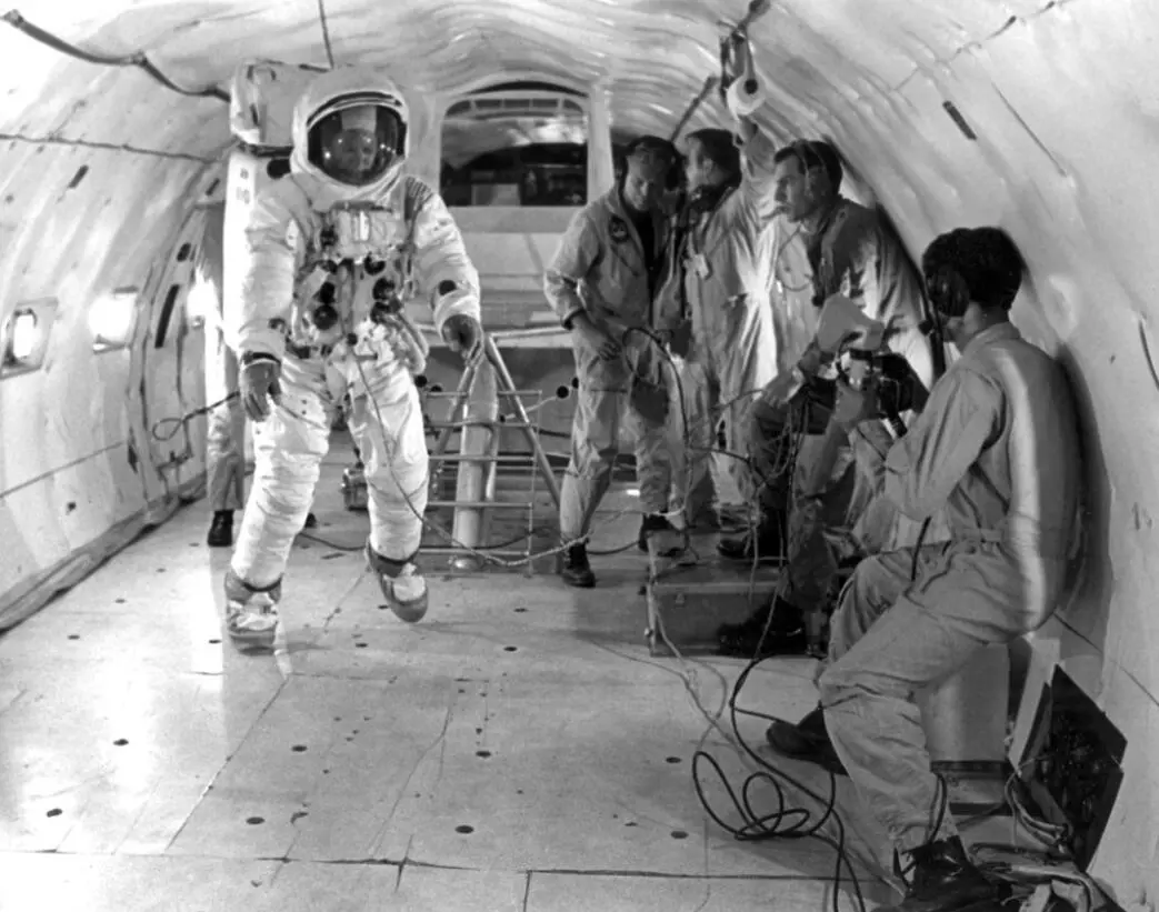 巴兹·奥尔德林(Buzz Aldrin)在从佛罗里达州的帕特里克空军基地起飞的一架KC-135喷气式飞机上进行零重力训练。 -