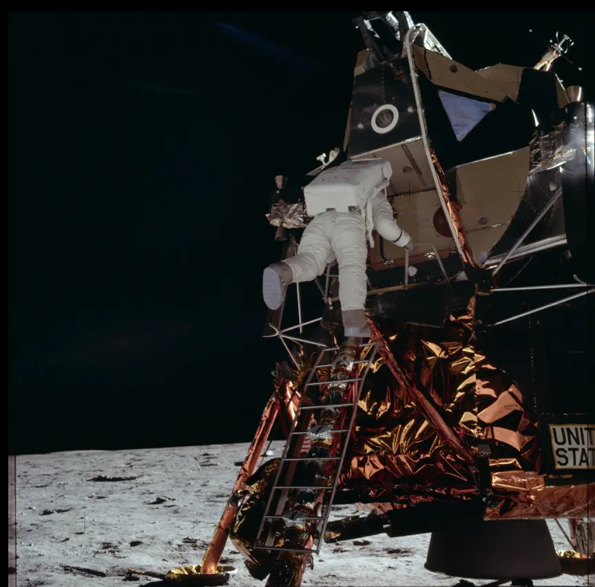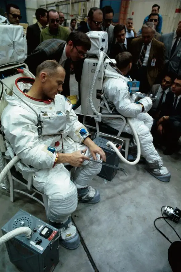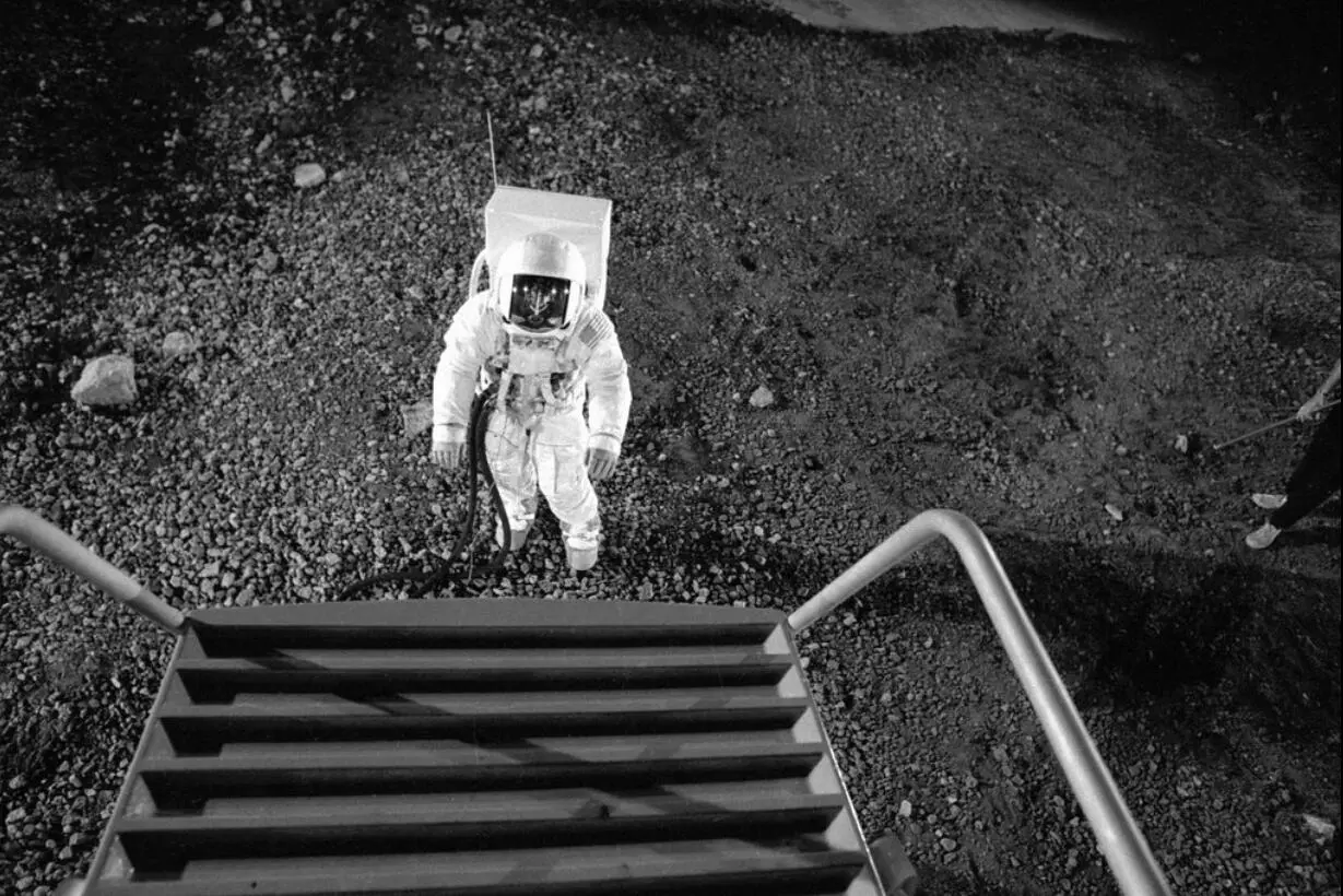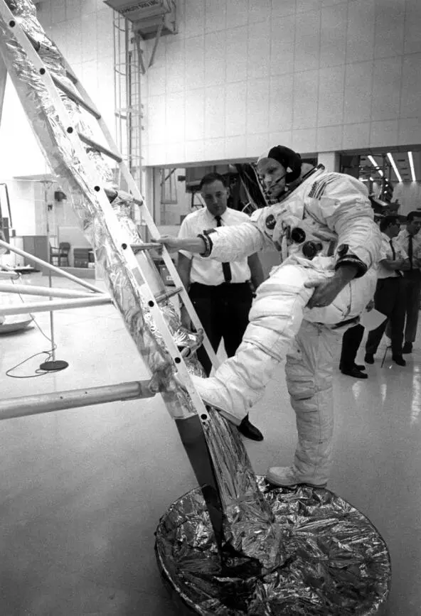 */7、尼尔·阿姆斯特朗(Neil Armstrong)在练习返回阿波罗登月舱的第一级阶梯。