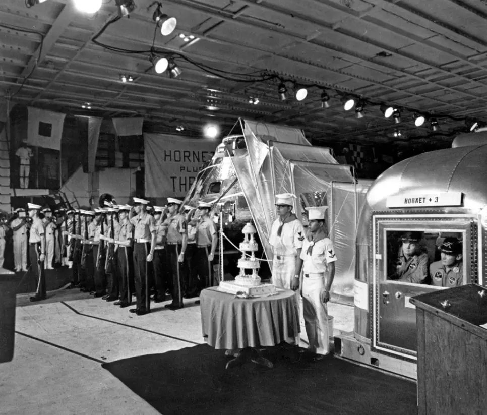 尼尔·阿姆斯特朗和巴兹·奥尔德林回到迈克尔·柯林斯所在的“哥伦比亚号”指挥舱,准备返回地球。 -