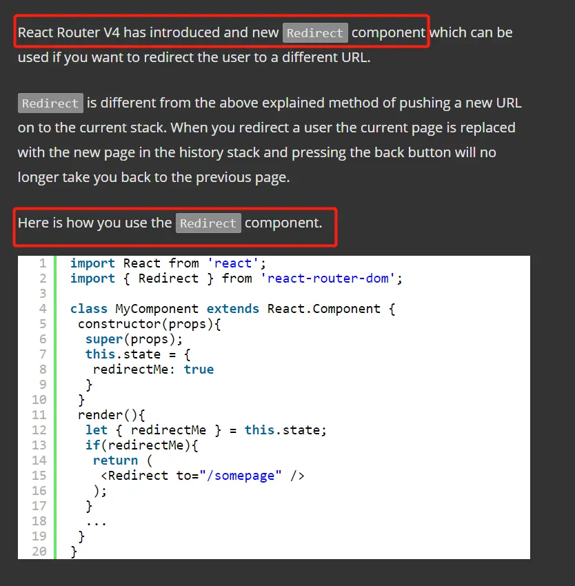 React Router V4实现登录后跳转思路 Frank同志68687 2019-07-16 2,929 阅读1分钟 3个方法 方法1:This.props.history serverless-stack.com/chapters/re… 方法2:Redirect component www.webdeveloperpal.com/2018/03/07/… 方法3:History package stackoverflow.com/questions/4…