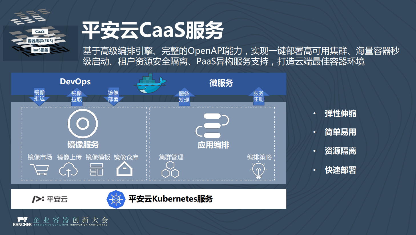 我们在平安云上提供了不同级别容器相关的服务,最底层毫无疑问的是I层的一些服务,从底向上我们会有Kubernetes集群,叫EKS,其上面我们会有Container Service,再往上我们会有PaaS平台,最上面是DevOps服务。这就是平安云上容器相关的几大服务。