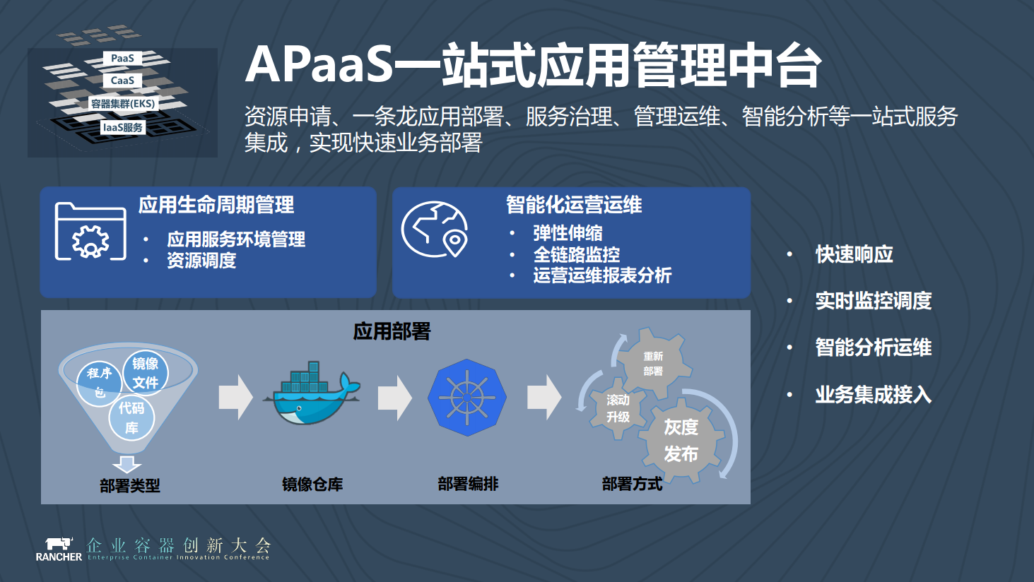 第三类服务就是我连容器都不想管理,有没有这样的服务呢?正如梁胜博士在前面提到的,他讲的是Rio,他们想构建一个MicroPaaS平台。这个有点像是平安云构建的PaaS服务,我们目前的产品叫做APaaS,APaaS的概念来自于Gartner,Gartner很多年前有份报告是分析平台层Platform Service里面到底有哪几类服务,它当时就把PaaS分为两大类,一类叫做APaaS,一类叫做IPaaS。APaaS就是我们这边在做的,IPaaS是APaaS之外的一些集成服务比如MQ、认证等。这些服务都是平台层的,它统一放在IPaaS里面。刚才梁胜博士讲的Rancher做的是一个微小的Micro Platform Rio。我最初在微软做Windows Azure,一开始定位在Platform Service,后来发现Platform Service有些问题,后来转到VM重新进入IaaS跟Amazon AWS是一样的。