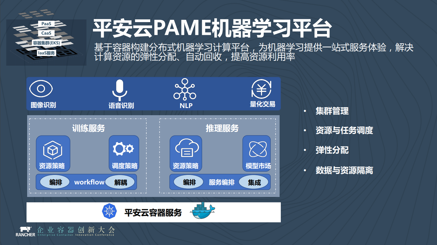 PAME平台和容器的关系在于它的资源分配是基于容器来进行的,底下是CaaS容器服务,容器服务底下的硬件上面有GPU支持,所以我们构建了PAME平台来简化机器学习使用。除了计算资源之外,在深度学习平台上,非常重要的一点在于怎样去管理数据,这是非常重要的。深度训练的数据从哪里来、怎么存储、怎么进来?模型导进来之后怎么去管理?这一切都是PAME需要解决的问题,所以PAME本身的定位也是PaaS的一种,它不是APaaS平台,它是在平台层的另外一类服务,跟容器有紧密集成的一类服务,叫机器学习平台。