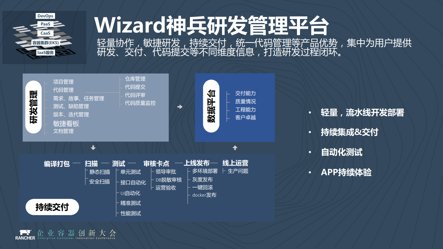 这个平台有几个特点,第一就是在整体的项目管理周期里面,从项目管理到代码管理,到需求故事,测试、版本迭代、敏捷看板所有这些功能都集中在一个产品里面。这是从研发管理流程上看,它可以部署到前面的我们讲到的平台,无论是CaaS还是APaaS也好,都是打通的。