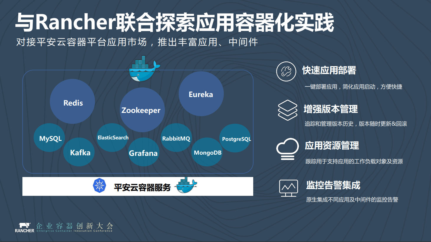 我们过去几年从各个层面上和Rancher都有比较多的合作,在这里分享的是与Rancher联合探索应用容器化实践。我们知道,在之前的大部分应用都不是用容器方式去构建的。Rancher在容器方面做得比较领先,而且一直非常专注地做容器相关的事情。我们和Rancher合作,把大部分我们内部常用的服务进行容器化包装、打包,可以作为服务化部署。无论是基于Helm还是基于Operator的方式,把它构建成不同的服务。