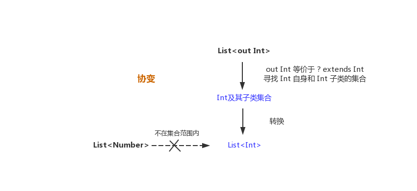 List<Int>在List<Number>协变的子类型集合中。意味着当需要List<Number>时,可以使用List<Int>来替换,List<Int>是List<Number>的子类型。符合协变的要求: Int 是 Number 的子类型,以致List<Int>也是List<Number>的子类型。