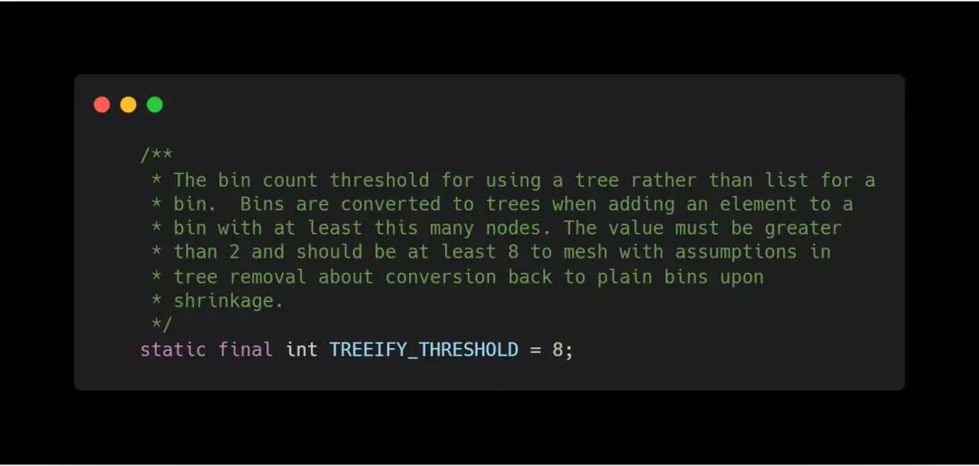 因为Map中桶的元素初始化是链表保存的,其查找性能是O(n),而树结构能将查找性能提升到O(log(n))。当链表长度很小的时候,即使遍历,速度也非常快,但是当链表长度不断变长,肯定会对查询性能有一定的影响,所以才需要转成树。至于为什么阈值是8,我想,去源码中找寻答案应该是最可靠的途径。