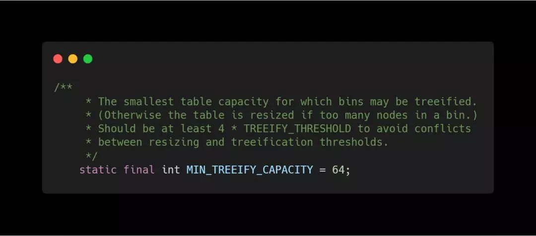 当Map里面的数量超过这个值时,表中的桶才能进行树形化 ,否则桶内元素太多时会扩容,而不是树形化 为了避免进行扩容、树形化选择的冲突,这个值不能小于 4 * TREEIFY_THRESHOLD
