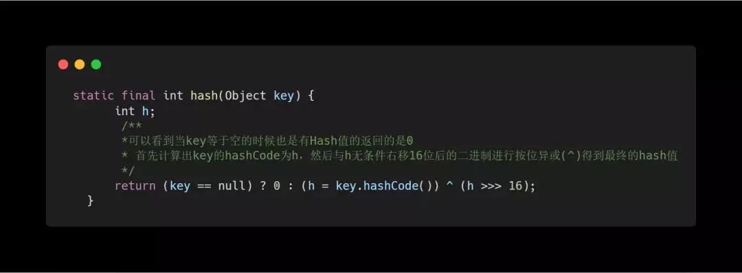 我们可以看到put调用的是putVal来进行数据插入,但是要注意到key在这里执行了一下hash()方法,来看一下Hash方法是如何实现的。
