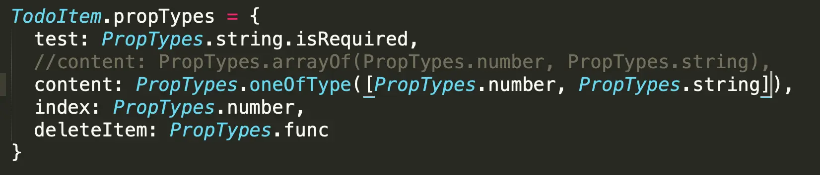 - oneOfType()表示输入的内容是number或者string,参数以数组的形式给出 \