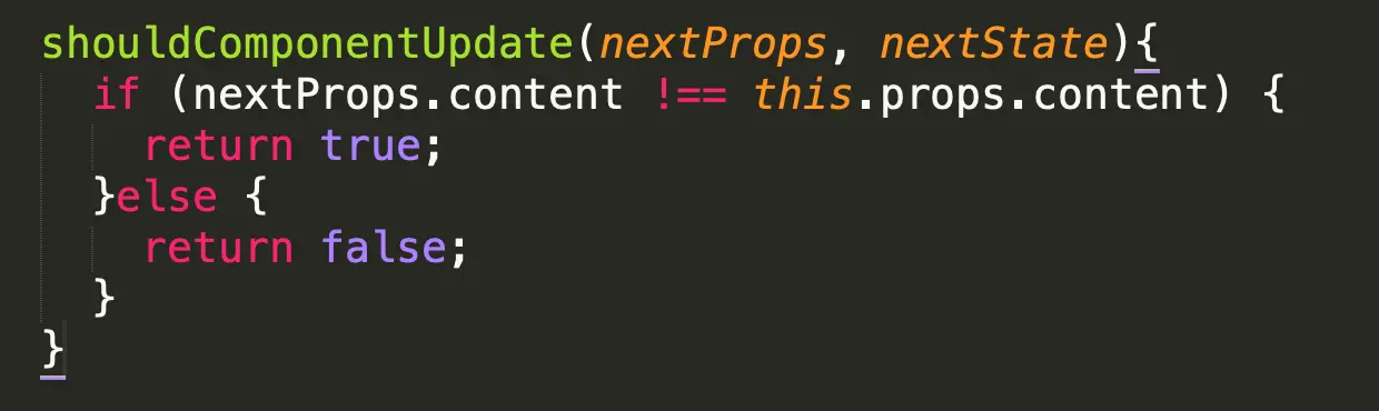 - shouldComponentUpdate():组件被更新之前,被自动执行。该函数返回一个bool值,若返回false,组件不会更新;一般返回true,执行下面的更新流程。