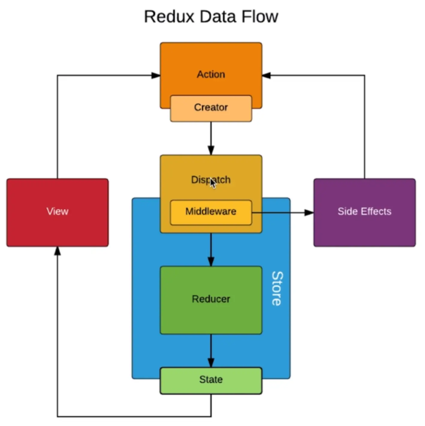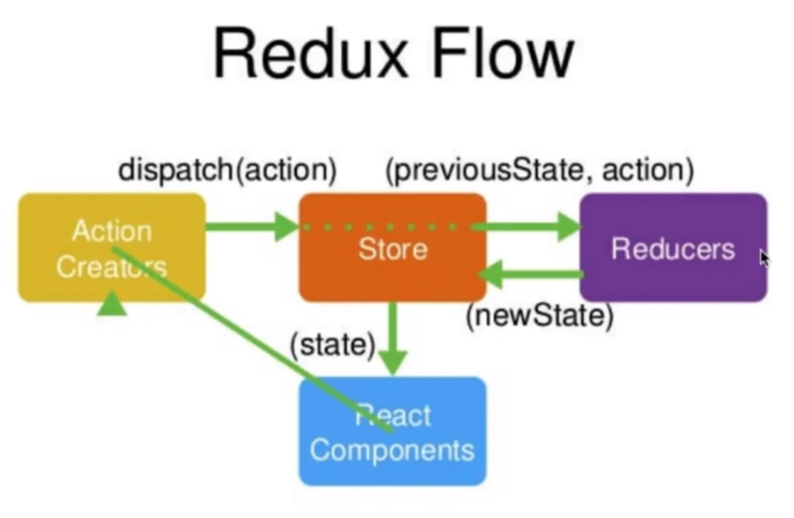 store.dispatch(action);传递给store。store接受到后,自动将当前数据和接收到的action转发给reducer - reducer对数据进行处理,返回新数据给store