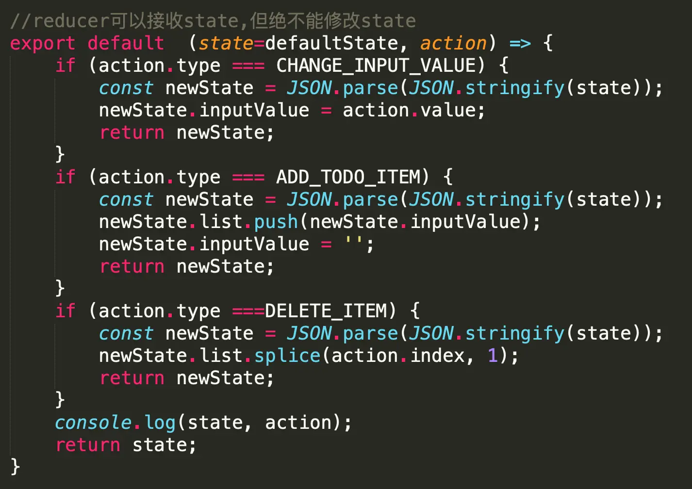 - Reducer必须是纯函数(纯函数:给定固定输入,一定有固定输出,并且不会有任何副作用)