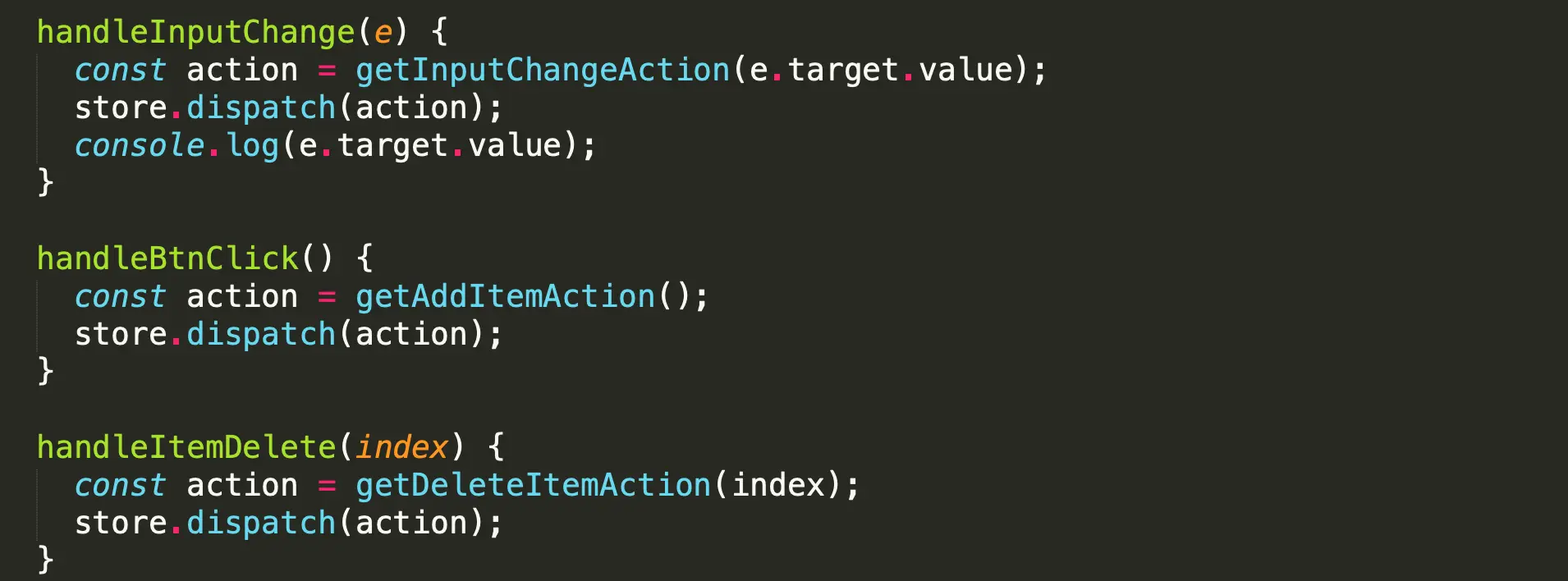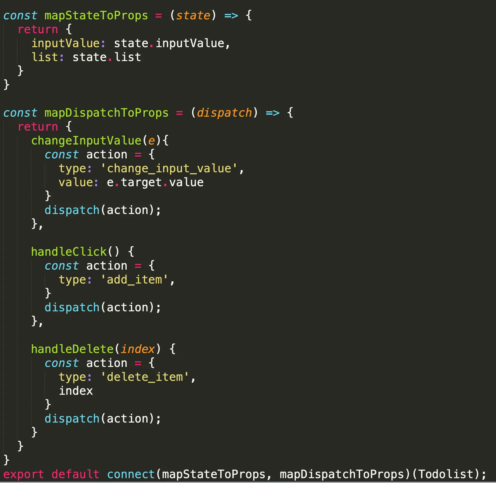 store.subscribe(this.handleStoreChange);store内容发生改变时,自动调用作为参数的该函数 在该函数中,再次获取store的值即可 - 可用过定义action中的type值方便调试
