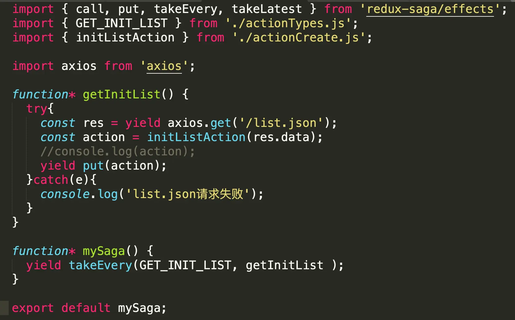 - 将异步请求代码写在sagas.js文件中