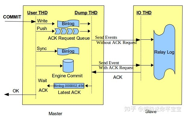MySQL官方针对上述问题,在5.7.2引入了Loss-less Semi-Synchronous,在调用binlog sync之后,engine层commit之前等待Slave ACK。这样只有在确认Slave收到事务events后,事务才会提交。如下图所示,图片引自Loss-less Semi-Synchronous Replication on MySQL 5.7.2 :