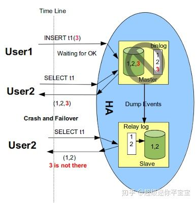 rpl_semi_sync_master_wait_point为WAIT_AFTER_COMMIT时,commitTrx的调用在engine层commit之后,如上图所示。即在等待Slave ACK时候,虽然没有返回当前客户端,但事务已经提交,其他客户端会读取到已提交事务。如果Slave端还没有读到该事务的events,同时主库发生了crash,然后切换到备库。那么之前读到的事务就不见了,出现了数据不一致的问题,如下图所示。图片引自Loss-less Semi-Synchronous Replication on MySQL 5.7.2。