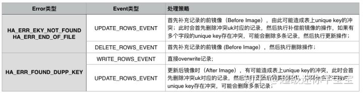 复制冲突自动处理:MySQL 5.5/5.6/5.7的参数slave_exec_mode用于解决主从复制冲突和错误。默认值是STRICT适合于所有模式(不解决冲突),值IDEMPOTENT 会忽略duplicate-key和no-key-found错误,也不适合解决上面主从不一致问题。我们从5.6开始给slave_exec_mode增加了一个值smart,用于自动修复一些场景(包括PK冲突及UK冲突引起的HA_ERR_KEY_NOT_FOUND/HA_ERR_FOUND_DUPP_KEY/HA_ERR_END_OF_FILE),具体处理策略如下图