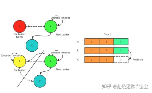 如上图所示,左上的Case是原Leader A节点宕机,此时在选举超时后,B节点开始尝试选自己为Leader, 并且C节点同意, 那么B成为新的主节点,集群正常运行。