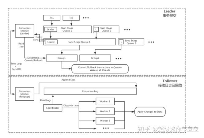 Follower节点收到Leader传递过来的日志以后将日志内容Append到Consensus Log末尾,由协调者负责读取并解析日志后传递给各个回放工作线程进行数据更新。由于Consensus日志是基于Binlog开发,回放可以利用MySQL-5.7的Logic clock并行复制特性。 相比MySQL-5.6中回放并行度受到表数目限制,MySQL-5.7可以做到依赖主库Group Commit的事务数进行并发回放,进一步提升回放的速度。