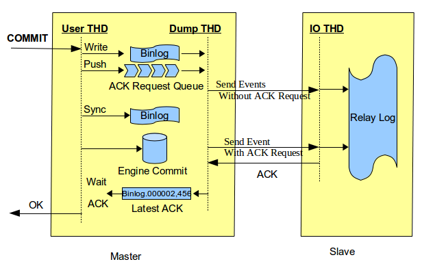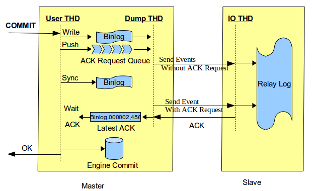 MySQL官方针对上述问题,在5.7.2引入了Loss-less Semi-Synchronous,在调用binlog sync之后,engine层commit之前等待Slave ACK。这样只有在确认Slave收到事务events后,事务才会提交。如下图所示,图片引自Loss-less Semi-Synchronous Replication on MySQL 5.7.2 :