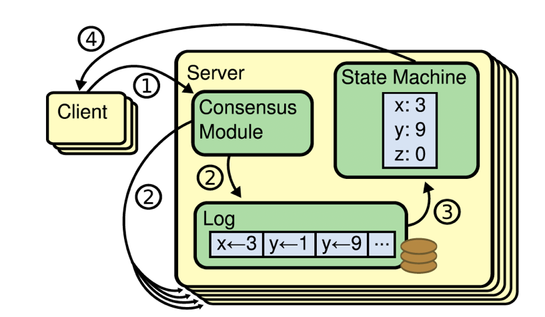 说到一致性协议,我们通常就会讲到复制状态机。一般情况下,我们会用复制状态机加上一致性协议算法来解决分布式系统中的高可用和容错。许多分布式系统,都是采用复制状都是采用复制状态机来进行副本之间的数据同步,比如HDFS,Chubby和Zookeeper等。