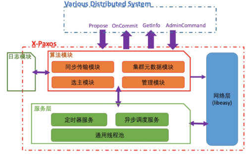 X-Paxos的整体架构如上图所示,主要可分为网络层、服务层、算法模块、日志模块4个部分。