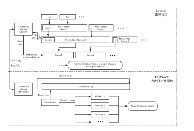 Follower节点收到Leader传递过来的日志以后将日志内容Append到Consensus Log末尾,由协调者负责读取并解析日志后传递给各个回放工作线程进行数据更新。由于Consensus日志是基于Binlog开发,回放可以利用MySQL-5.7的Logic clock并行复制特性。 相比MySQL-5.6中回放并行度受到表数目限制,MySQL-5.7可以做到依赖主库Group Commit的事务数进行并发回放,进一步提升回放的速度。