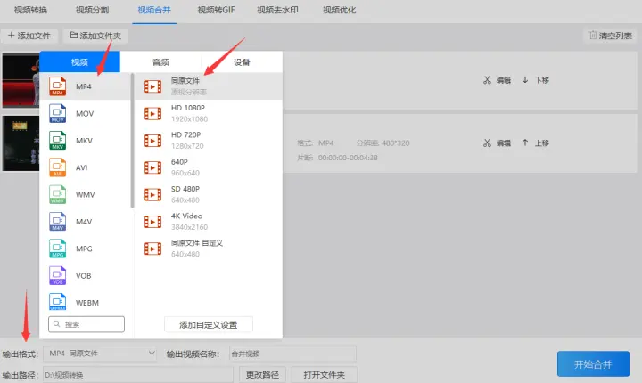 编辑好视频后设置“输出格式”,此时可以设置输出的视频格式和视频分辨率。因为mp4格式的视频相对较小,所以一般把视频格式设置为‘mp4’格式。而视频分辨率一般则设置为和原视频相同分辨率的‘同原文件’格式。