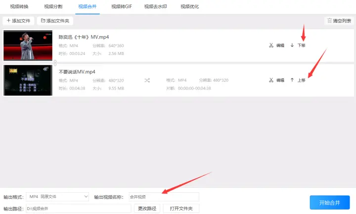把功能调为“视频转换”后把需要合并的视频添加到软件中。添加的时候文件少的话可以点击“添加文件”按钮依次添加视频,文件多的话可以点击“添加文件夹”按钮,或者直接把视频拖拽到软件批量添加视频。小编用两个mv视频作为本次示范的案例。