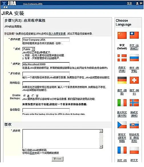 安装好之后就首先要在服务器上通过http://localhost:8080为服务进行配置(8080是 Jira的端口),具体需要经过三个步骤完成: